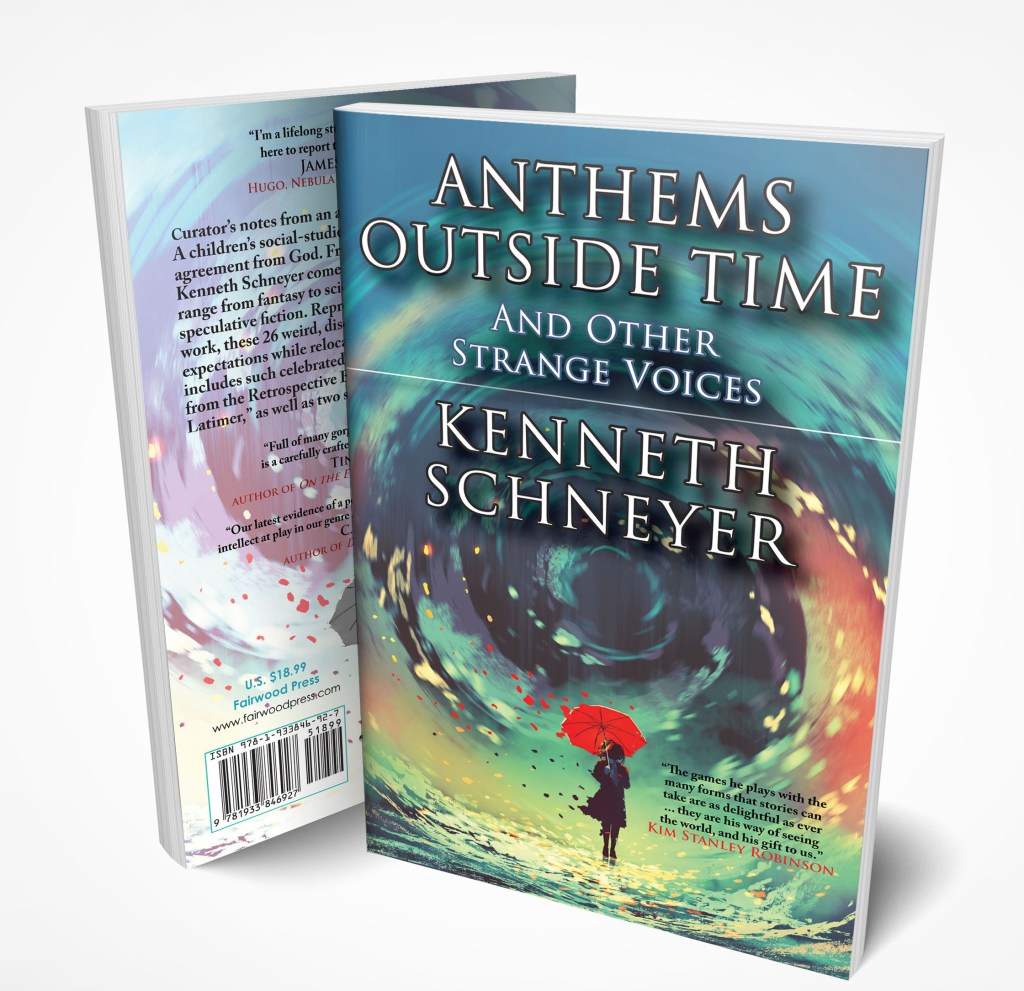“Kenneth Schneyer’s new collection, Anthems Outside Time and Other Strange Voices, is our latest evidence of a powerful, flexible, and relentlessly curious intellect at play in our genre. No story is like the next; each one shines with its own indomitable haecceity. Awkward sex, unreliable narrators, recorded memory as witness, contracts as characters, strange storms, grim revolutions, and—oh!—the awful melancholy of a weaponized toddler descending on her red balloon: Anthems is yet warm, human, and unafraid to despair. In the end, it is that very fearlessness, no matter how bleak or brutal, that brings the reader back to hope.”